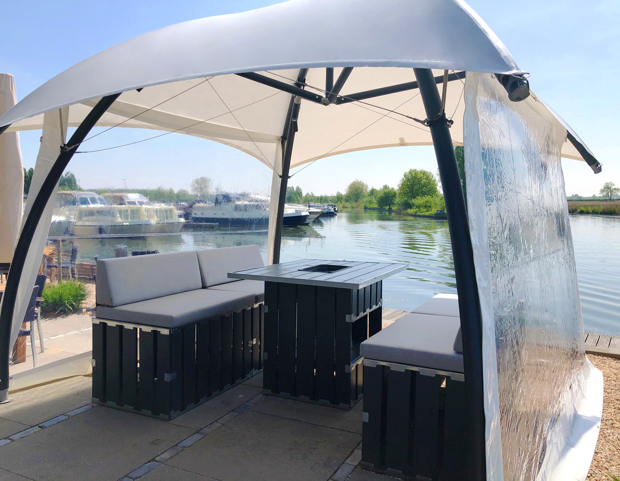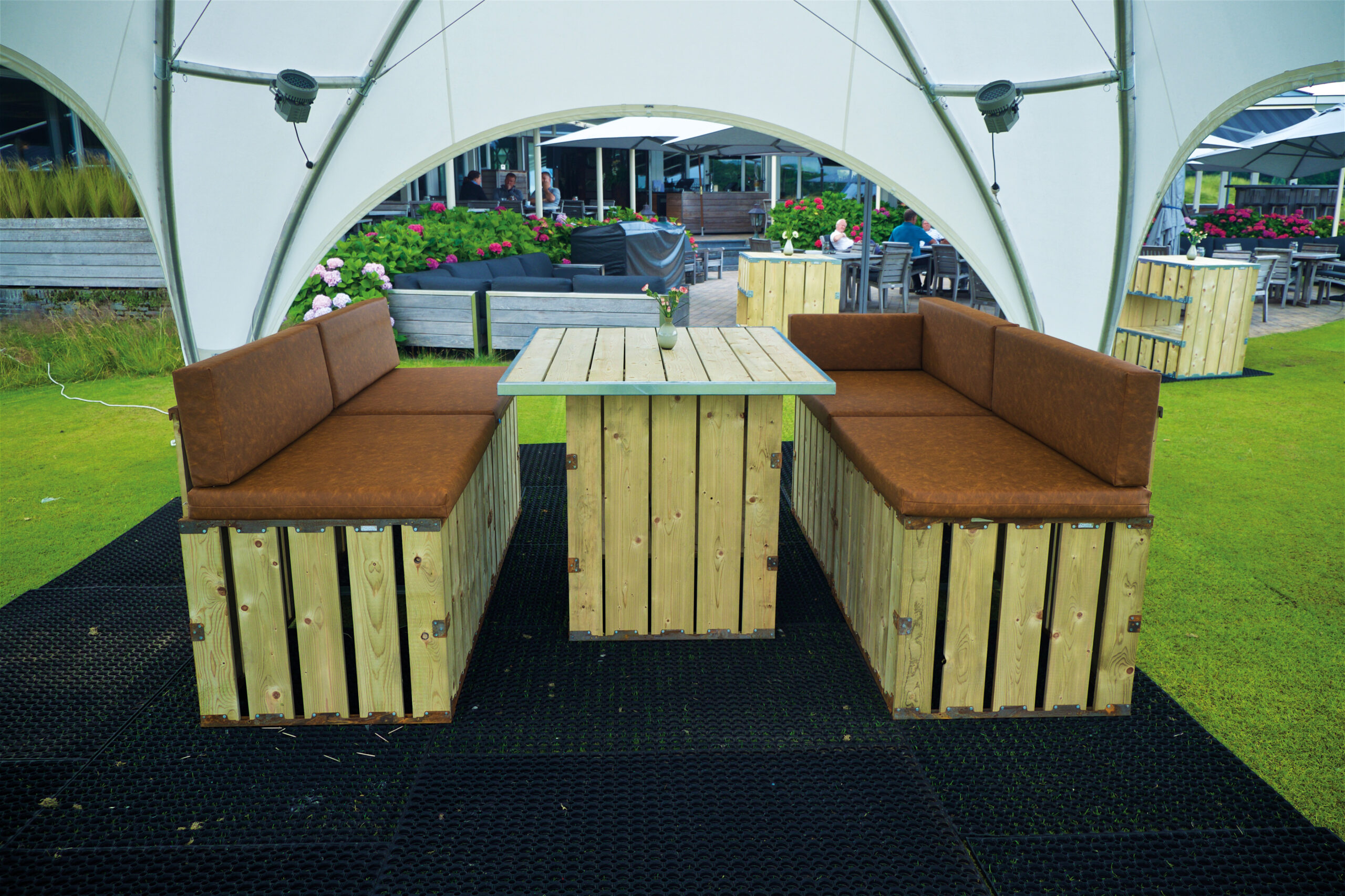 Brand it your way: print your logo on the wooden panels and add printed or embroidered cushions for a unique lounge setup.