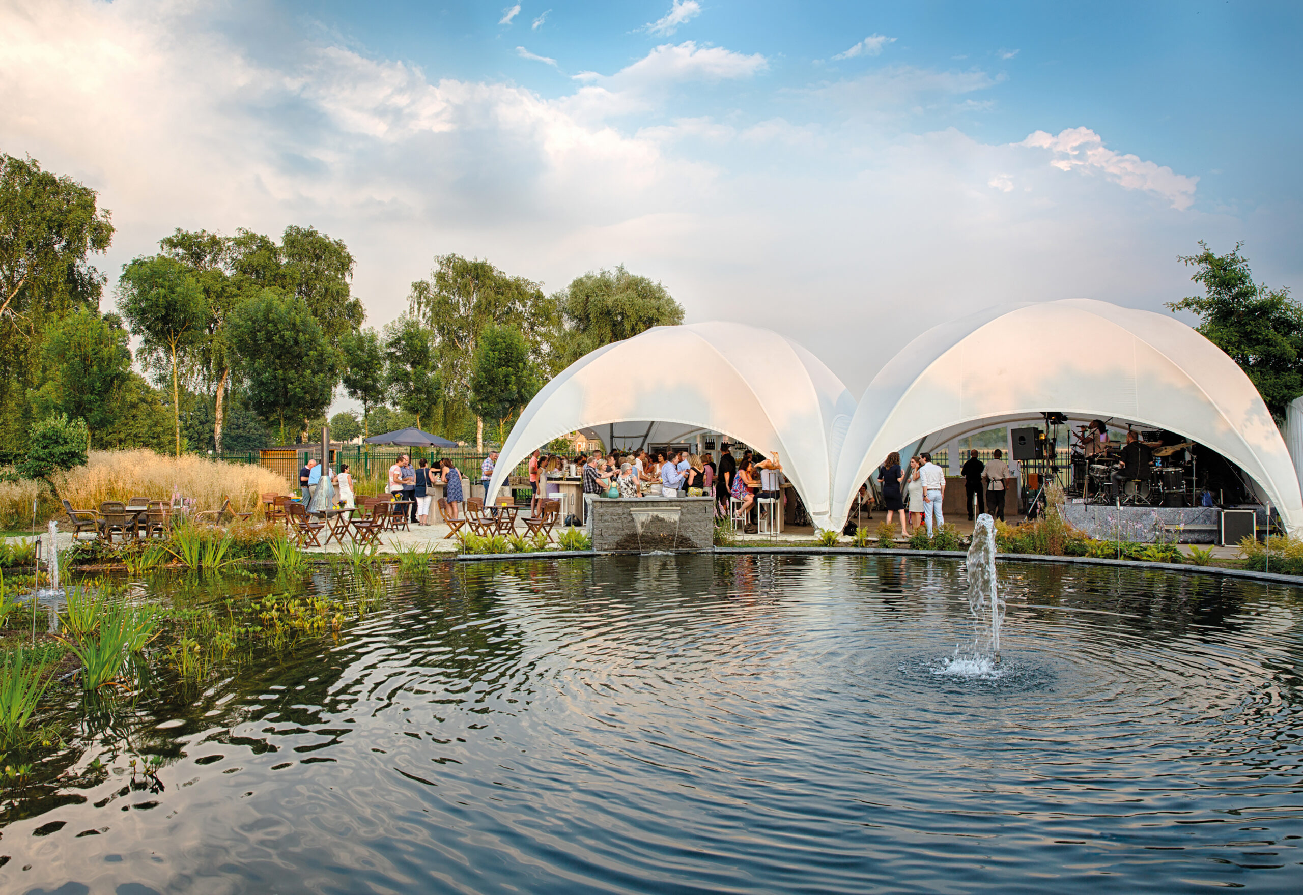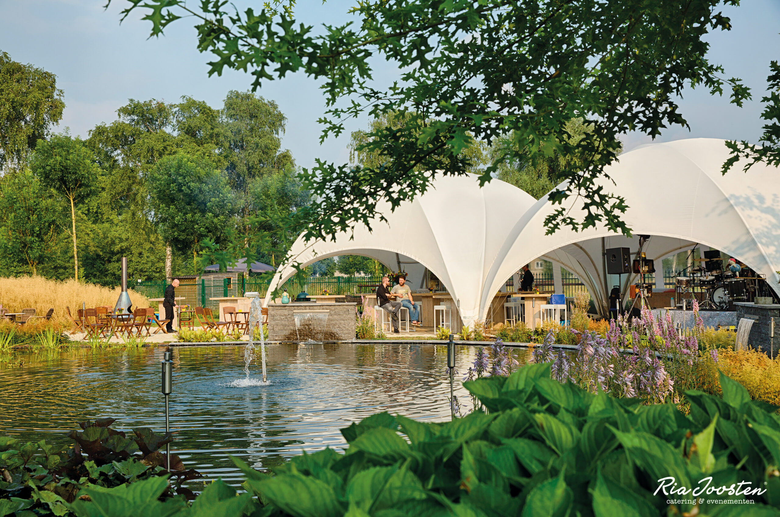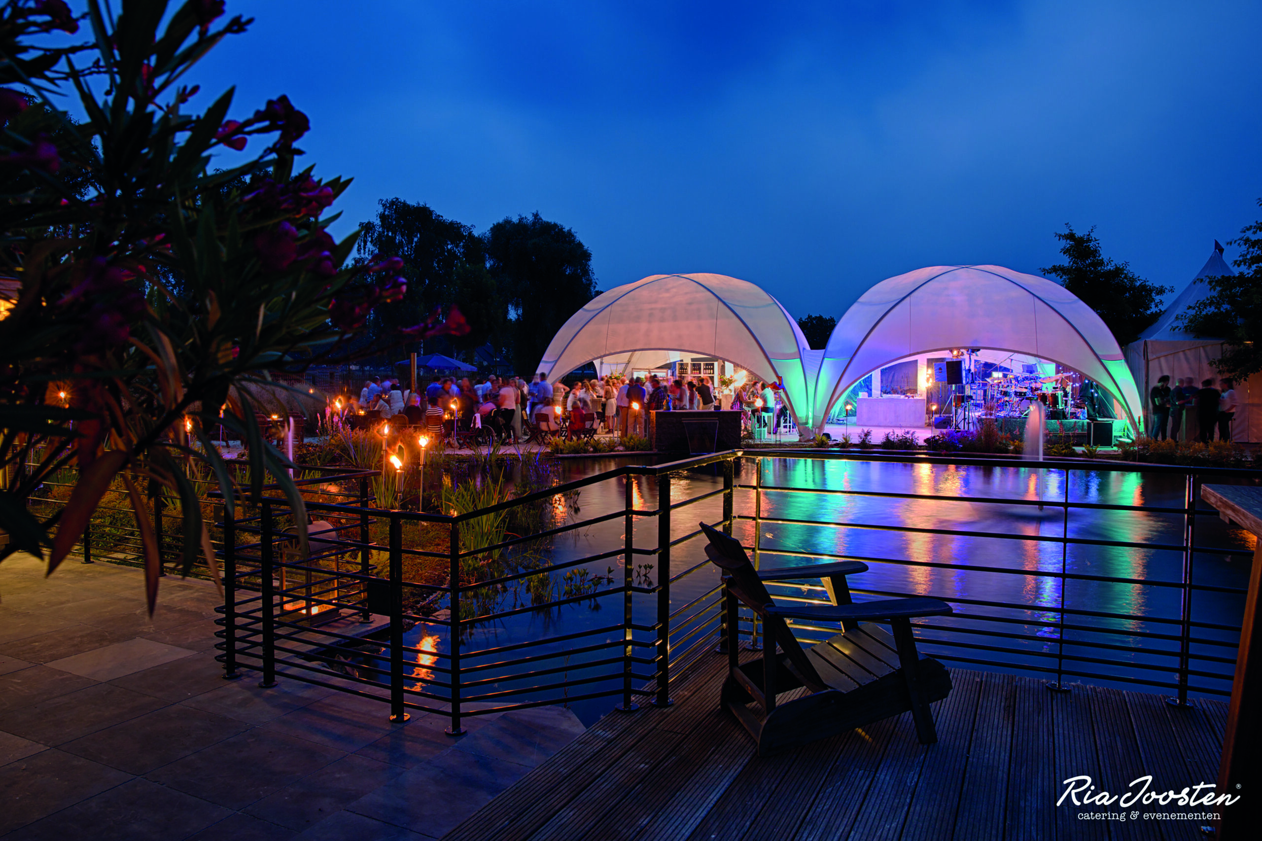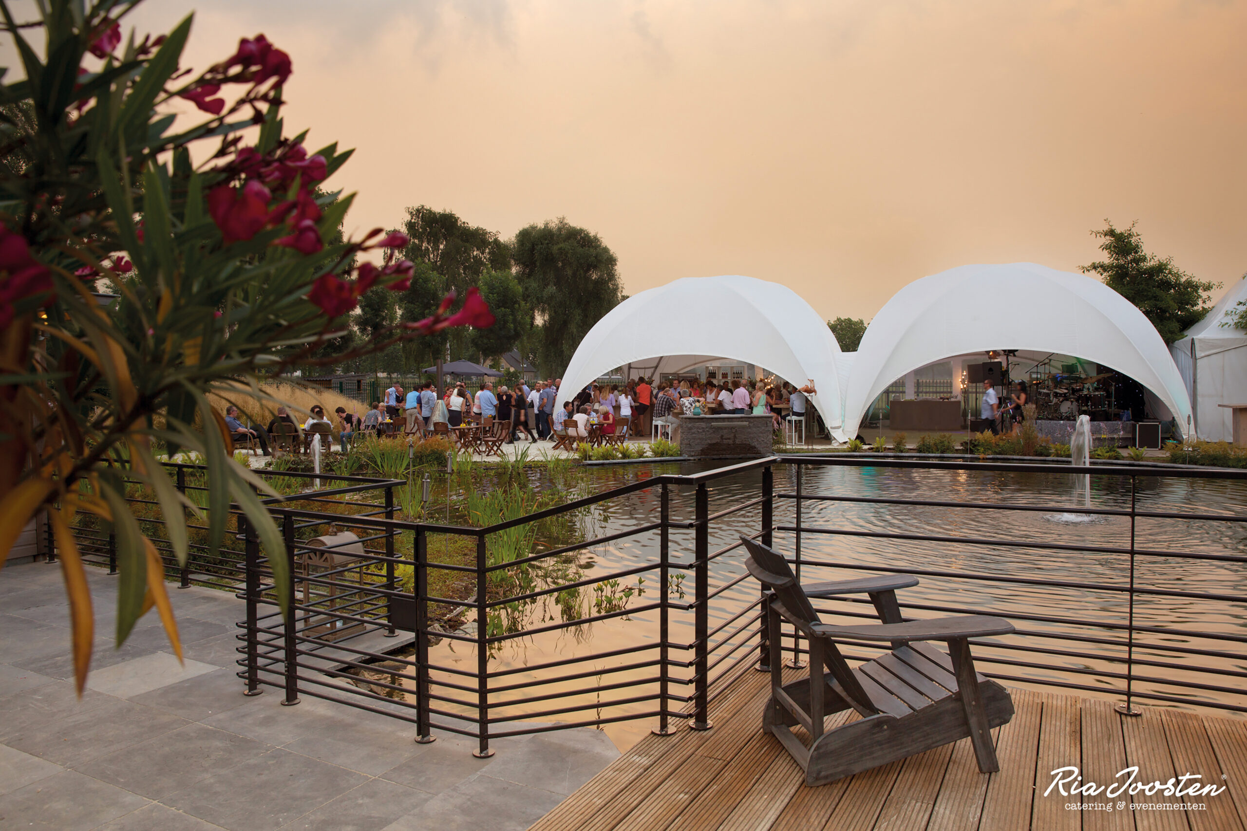At a private business event in the Netherlands, two Crossover Large tents created a stylish and functional space by the water. The tents provided ample room for guests to stay dry while enjoying a bar and live music from a band performing inside. As the evening continued, the setup transformed into a lively party space, combining comfort, design, and a memorable atmosphere for all attendees.
